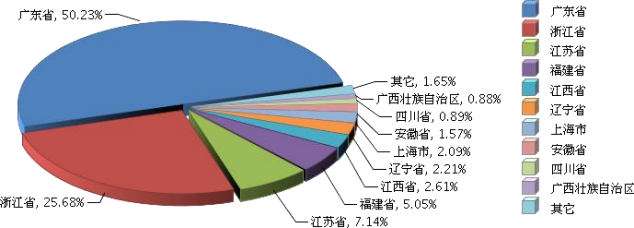 2023年1~9月 ,全国照明行业完成累计出口交货值733.23亿元 ,同比增长-13.26%。 出口交货值排在前五位的地区依次为广东省、浙江省、江苏省、福建省、江西省。其中 :广东省完成累计出口交货值368. 34亿元(占50 .23%) ,同比增长-12 . 14% ;浙江省完成累计出口交货值188.29亿元(占25.68%) ,同比增长-16.36% ;江苏省完成累计出口交货值52.33亿元(占7.14%) ,同比增长-8.73% ;福建省完成累计出口交货值37.05亿元(占5.05%) ,同比增长-23.18% ;江西省完成累计出口交货值19.15亿元(占2.61%) ,同比增长3.35%。