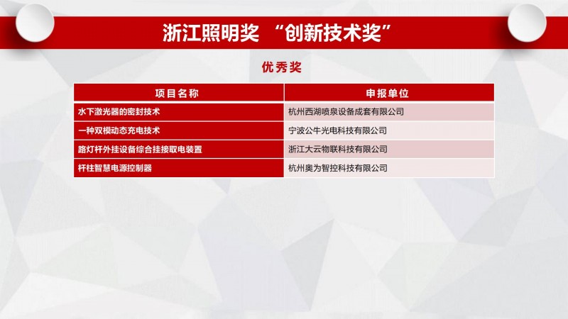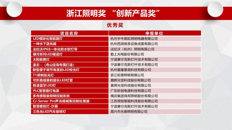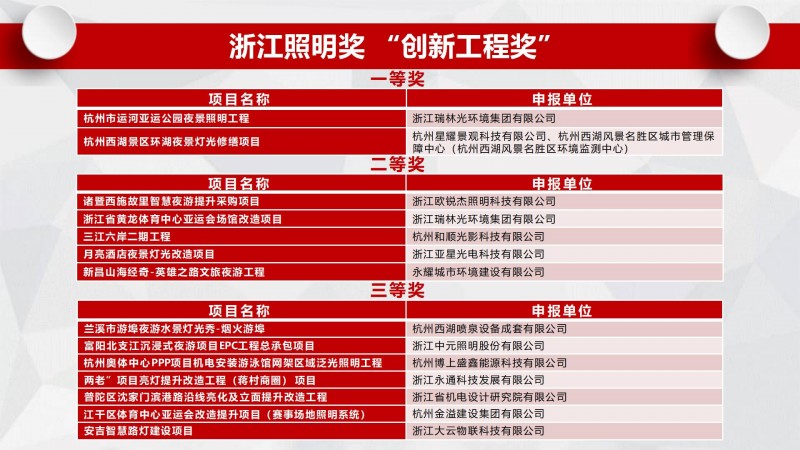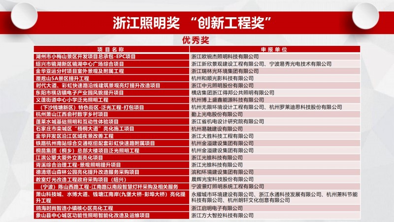 优秀设计、工程项目 ,以表彰敢于创新、善于创新的优秀业绩 ,开展第三届浙照奖的申报和评选活动 ,会员单位和企业踊跃进行了申报 ,共收到产品类、技术类、工程类、设计类成果申报近百项。经过资料审核 ,专家初审、复审 ,和来自全国的知名专家终审 ,报协会理事长办公会议审批 ,最终评选出 :