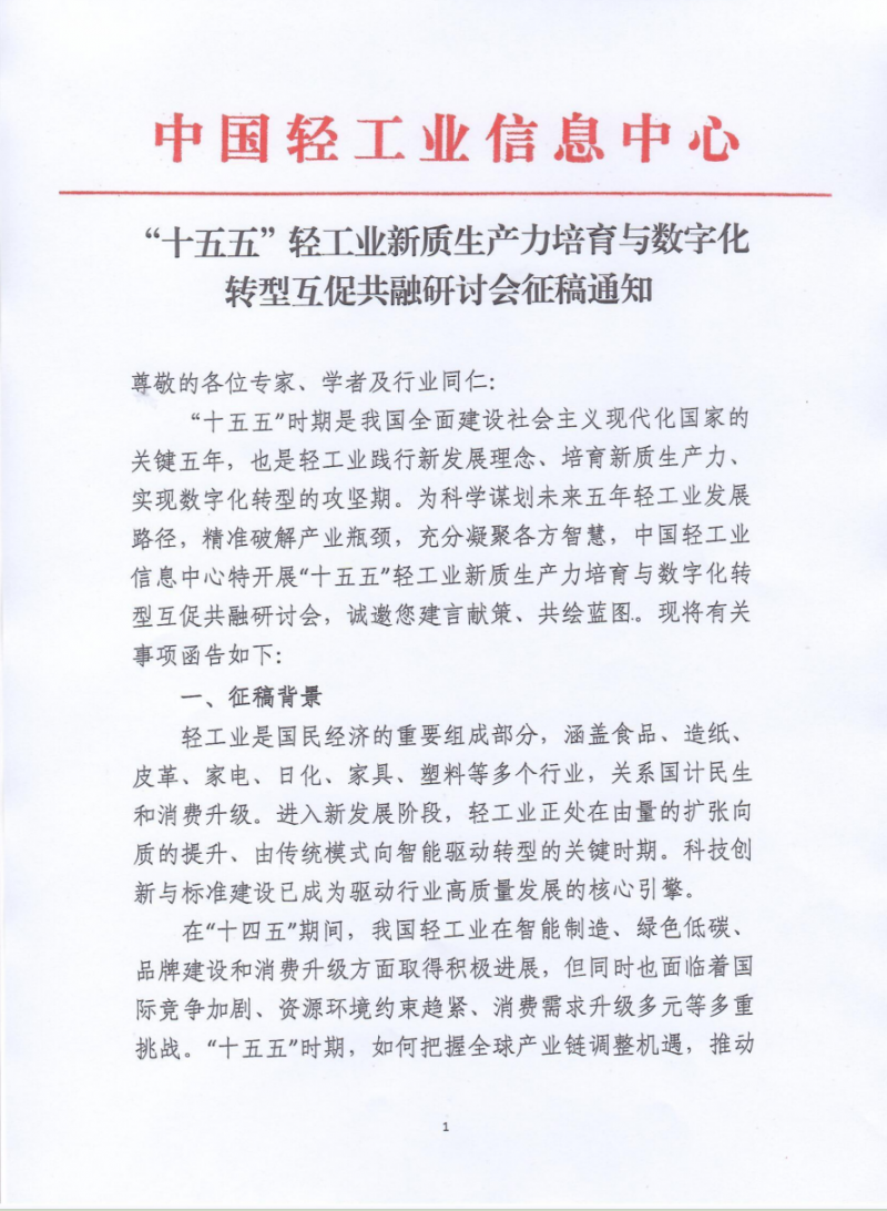【转载】征稿通知 |“十五五”轻工业新质生产力培育与数字化转型互促互融研讨会