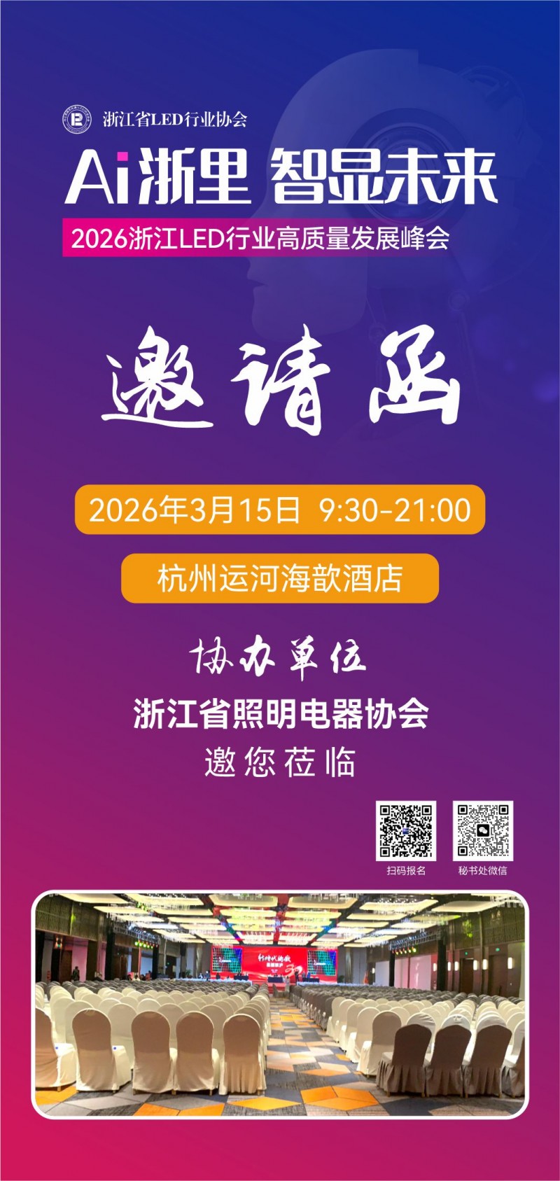 3月15日下午13:00,“AI浙里·智显未来”2026浙江LED行业高质量发展峰会隆重开幕。峰会由中国光学光电子行业协会发光二极管显示应用分会指导,浙江省固态光源行业协会(浙江省LED行业协会)主办,杭州海康威视数字技术股份有限公司冠名,联合十余家省级兄弟行业协会与多家行业龙头企业共同协办。
