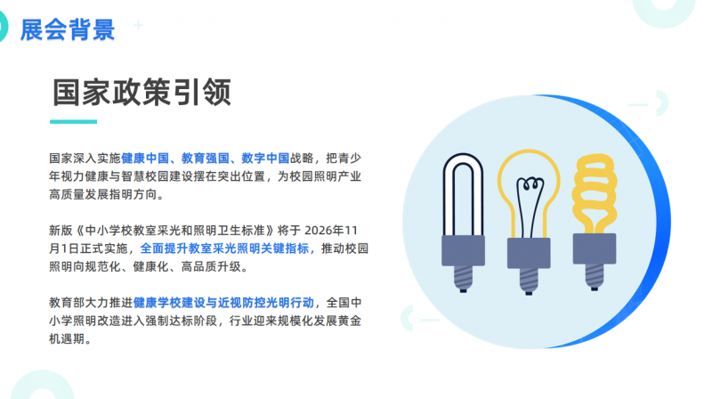 当前,国家深入实施健康中国、教育强国战略,青少年视力健康与智慧校园建设被摆在突出位置。新版《中小学校教室采光和照明卫生标准》将于2026年11月1日正式实施,全国中小学照明改造进入强制达标阶段,教育照明市场规模呈现爆发式增长。