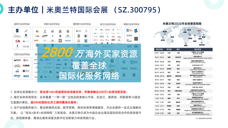A:首先参展企业可免费入驻米奥兰特13国语言数字预展平台,平台拥有2800万海外买家资源,将针对照明品类定向推送采购需求,提前配对预约;其次展会期间将举办跨境商贸对接会,2000+海外买家将到场洽谈;企业也可提前注册AI会展网,查看真实海外买家数据,提前对接需求。